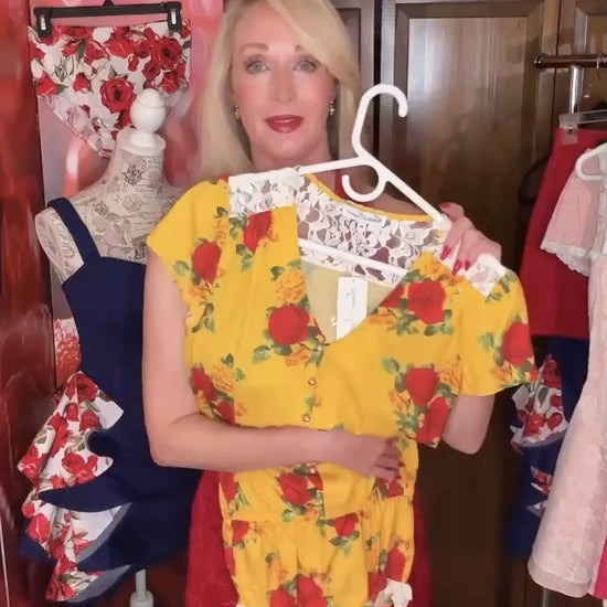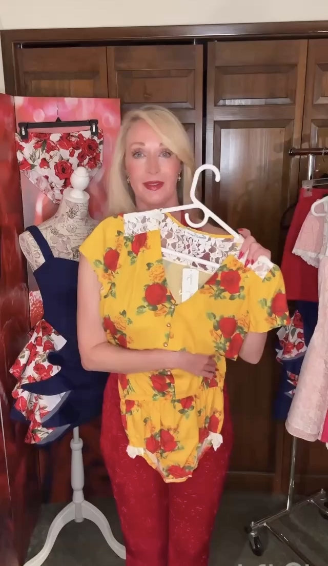 Fabric - Golden yellow with red, orange and green rose-print. Shell: 95% polyester/ 5% elastane.